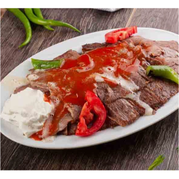 Dönervlees op stukjes gesneden brood overgoten met tomatensaus en hete roomboter